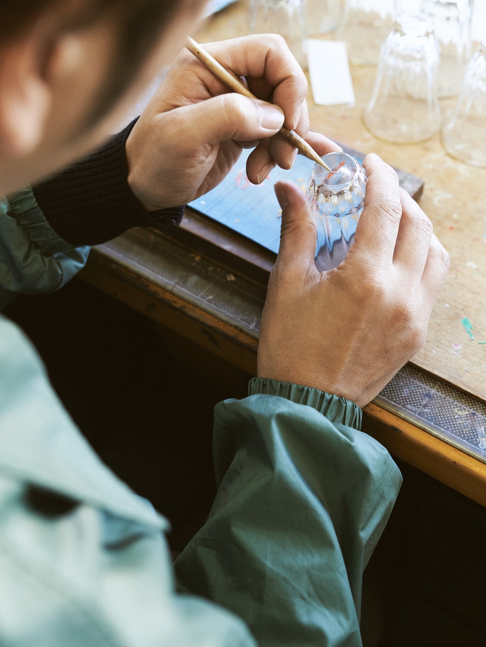 ガラスは表面が完全に平らではないため、螺鈿をぴたりと貼り付けるには高い技術が求められます。さらに、通常の螺鈿細工と異なりガラスは透明なため、裏側の仕上げにも気を配る必要があります。グラスの内側はもちろん裏側も美しい青貝塗りには、職人技の粋が詰まっているのです。